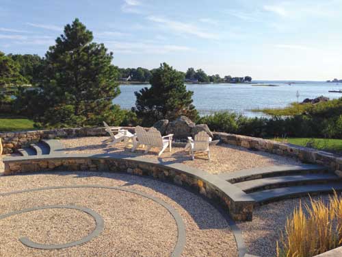 Spectacular water views along the rocky coastal area of Darien, Conn., provided inspiration for the design of an outdoor entertaining terrace that would serve as a transition to the home from an existing elevated deck. A simple spiral of bluestone set in peastone forms the elegant basis of this nautically inspired design. Curved stone seat walls embrace this spiral, providing seating for family gatherings. Curved bluestone steps lead to an elevated firepit. Sweeping curved platforms of peastone with bluestone risers form a transition to the lower level lawn area. Existing rock outcroppings were incorporated into these steps. Similar large boulder accents were designed into the stone walls and firepit, recalling rocky outcrops in the surrounding waters. From an environmental standpoint, and in the wake of Hurricane Sandy, any design on this vulnerable property had to be both environmentally sustainable as well as beautiful.