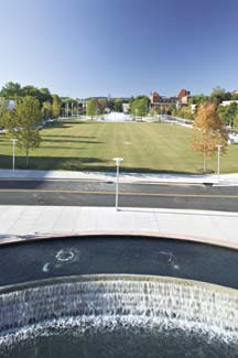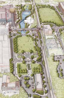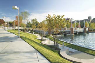 Surrounding the landscape are appropriate areas of pavement and other hardscapes in the form of walkways, plazas and gathering/arrival areas. In addition to paving, landscape, and water; park features such as signage, sculpture and lighting contribute a strong sense of place.