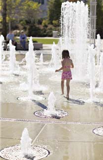 Water is a major element in the Festival Lawn area. The Court of Flags fountain at the north end of the lawn is a major interactive water feature that is enhanced with fog effects, lighting and performance programs synchronized with various musical selections. The area attracts children and adults to play in the dancing waters.