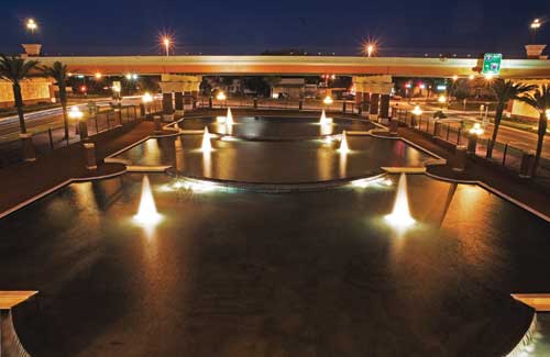 Each basin contains a series of illuminated fountain spray rings. Each spray ring is adjustable to propel water up to 12 feet high. The water feature?EUR??,,????'???s mechanical system, a sand filter, chlorinator and centrifugal pumps to power the upright fountain jets, is located under an overpass surrounded by a decorative brick wall, which blends in with the other elements of the project.