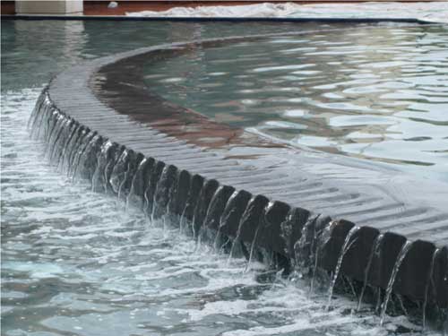 Surrounding the water feature is a 2.5-ft. tall brick knee wall, with black steel picket fencing for a total height of eight feet. This provides security and prevents casual access to the water feature area, necessary because of the danger of the surrounding roadways that have to be crossed to get to the fountain. The water feature consists of four large basins, each a solid mono slab of concrete, and each two feet lower than the other to accommodate the site?EUR??,,????'???s natural eight-foot slope. Each basin pours into the next lower pool. Water is pumped from the lowest basin back to the uppermost basin for recirculation. The pool depth is only 18 inches, but the basins are sealed with black marcite, which gives an illusion of depth.