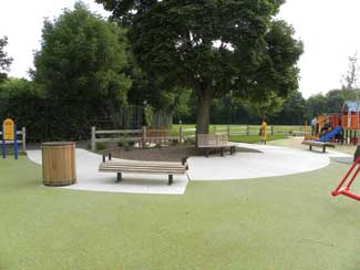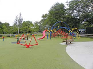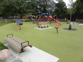The playground exceeds safety and handicapped accessibility standards. Poured-in-place safety surfacing throughout the design was requested by the residents. The surfacing, installed by Recreation Concepts out of Oswego, Ill., is also environmentally friendly because it is made of recycled tires. The light green color of the safety surface reduces the heat island effect of the playground, and the porosity of the surfacing decreases water runoff at the site. One of the issues the park district has seen over the years with poured-in-place safety surfacing is that it wears down under the swings where children are constantly dragging their feet. To alleviate this concern, the park district specified the use of safety surface tiles, which are made of a tougher material that will not only last longer, but also allows for ease of replacement of individual tiles as it becomes necessary.