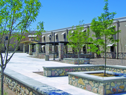 The courtyards were designed for users to gather for work, recreation, social events and ceremonies. Desert plant materials, native aggregates, and crushed and decomposed stone were used extensively to reduce irrigation needs and lower maintenance requirements. The development uses native plants to accentuate facades, enhance open spaces and punctuate vertical character.