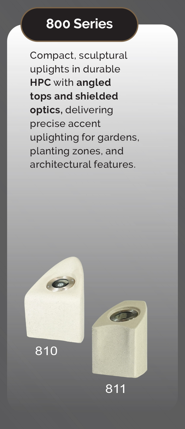 Compact, sculptural uplights in durable HPC with angled tops and shielded optics, delivering precise accent uplighting for ga...
