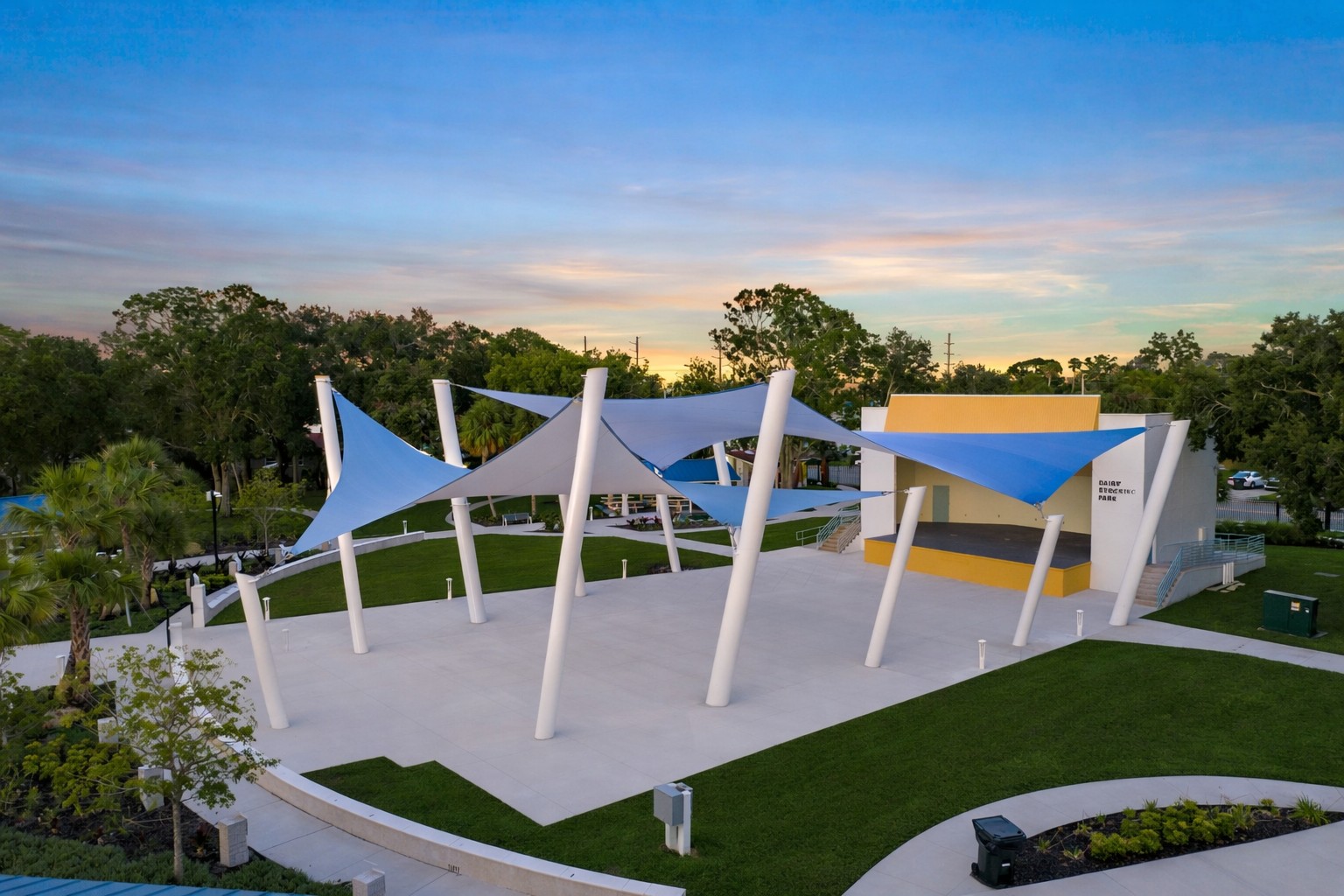 Our Sky Manta consists of a tensioned shade sail that projects up and outward to the sky mimicking a soaring Manta Ray. The s...