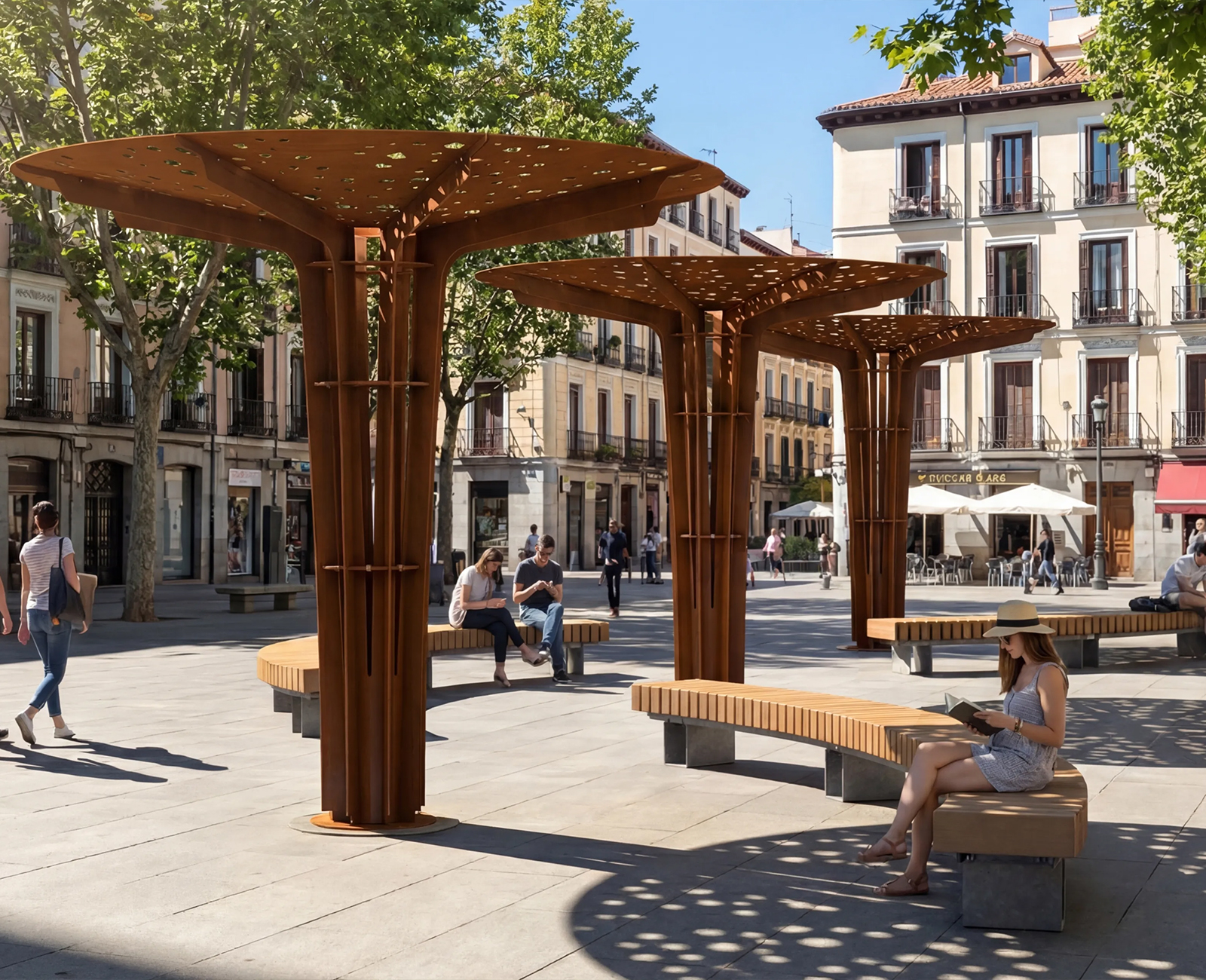 Like the Wild Grass Pillars, the Wild Grass Shades are artificial tree structures made of Corten or powder-coated steel, fitt...