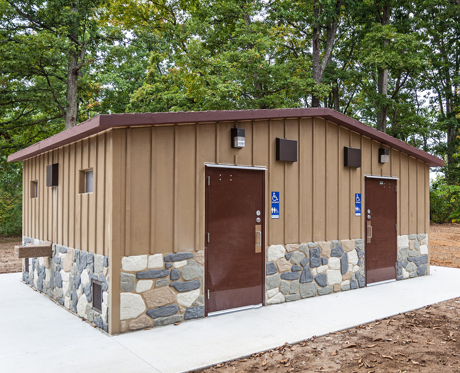 The Essex unisex restroom from Easi-Set offers four individual units containing stainless fixtures, and a chase for mechanica...